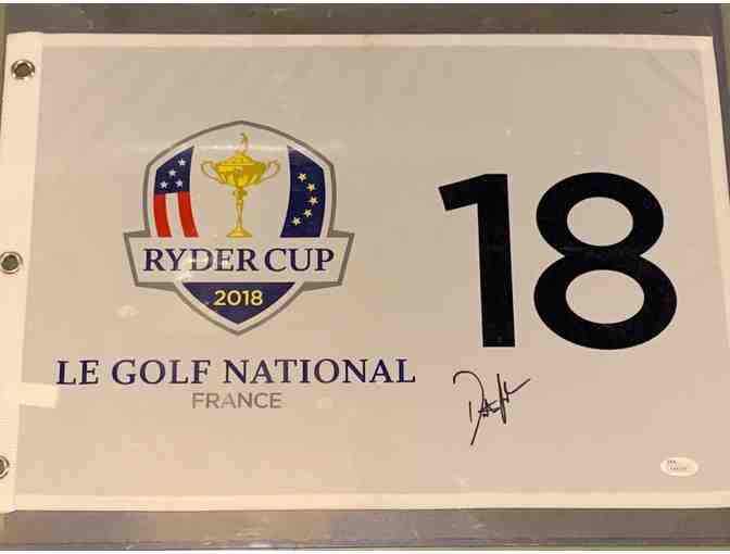 Dustin Johnson Autographed Ryder Cup Golf Flag. Comes with a certificate of authenticity.