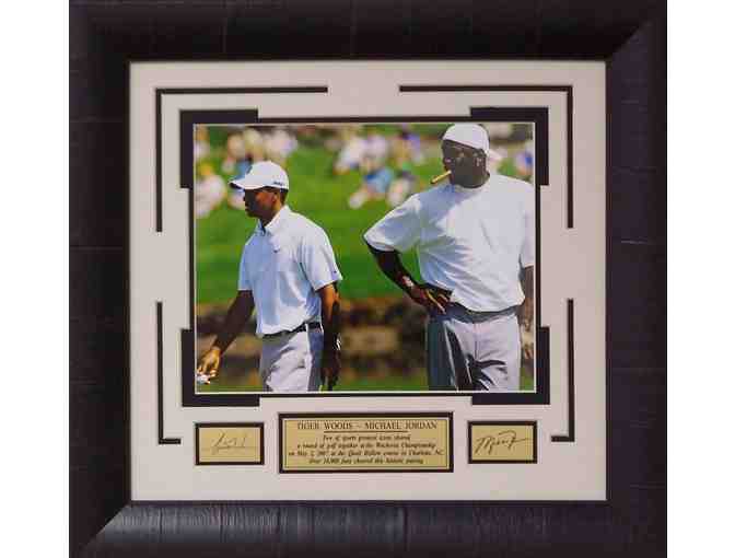 Tiger Woods and Michael Jordan are two of the greates athletes of their sport. Piece is professionaly framed and has facsimilie autographs. Size approximatelt 17" by 11".