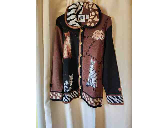 Storybook Knits animal print sweater (cardigan) with cute ktties. It has very unique butons that have beautiful cat faces. It is 33% Ramie, 40% Cotton and 7% Acrylic. Handwash in cold water; reshape and lay flat to dry. The dimensions are 20.5" armpit to armpit, and 26" shoulder to arm. Size small, but will fit most M/L as it is generously sized.