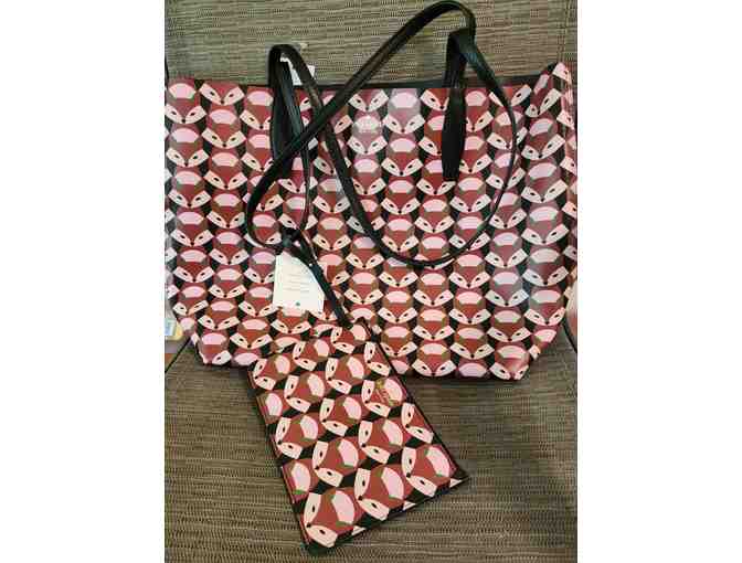 Kate Spade out of the woods Geofox large reversable tote with zipped pouch. Sturdy, beautifully made tote bag with wimsical fox faces. Large bag is 18" wide and 13" deep. Small bag is 8" wide and 5" deep. Handle drop 10". The bag is unlined and the material is refined, grain leather.