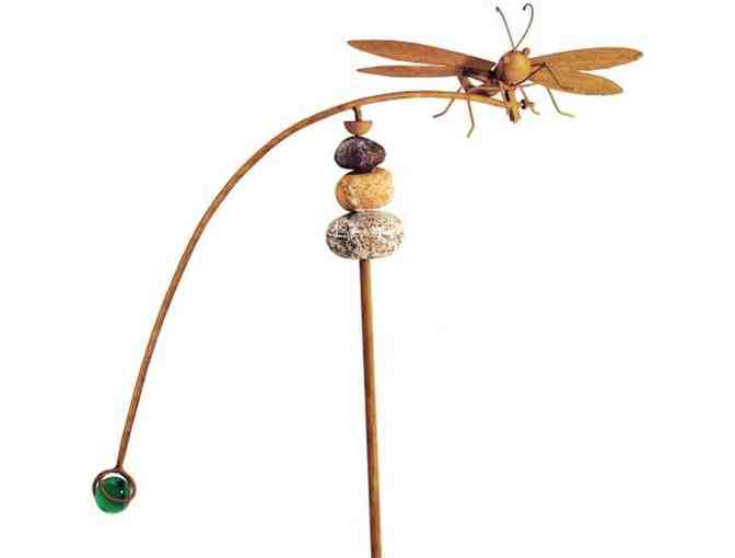 This yard ornament is a unique sculpture featuring a metal dragonfly that balances on a 42” post and moves gently in the breeze. It adds a whimsical touch to any garden.