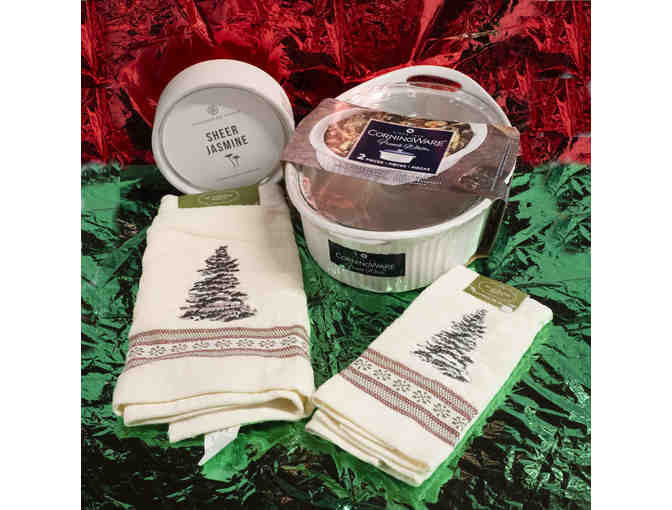 So elegant! Chesapeake Bay 3-wick Jasmine candle, 2.5 qt. Corningware oval baking dish with glass lid and 2 pc. winter towel set