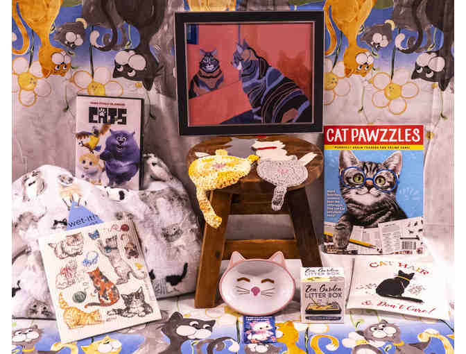 This goody grab box is for those who truly love cats. Sturdy wooden stool Cats w/Heart design 10.25H 10W, soft polyester throw 50x60, ceramic dish, magnet, Cats DVD, 2 crocheted cat butt coasters, 2 kitty eco-friendly sponge cloths, Cat Pawzzles book. framed cat print, and mini Zen Garden litterbox kit.
