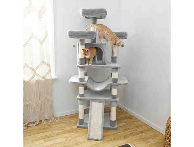 Frisco 68-in Faux Fur Cat Tree & Condo, Gray Take your cat tree game to new heights with this tall, plush cat tree from Frisco by Chewy. It has everything your kitty needs to play, scratch and lounge. Thats one private condo, three top percheseach with a removable, machine-washable bolstered perch covera plush hammock, sisal-wrapped scratching posts, a sisal scratching ramp, and fuzzy balls for some batting fun. The plush fabric throughout feels soft to the touch and adds a luxurious, velvety look. Imagine all the purring possibilities! Your cat will love snuggling in one of the bolster beds at the top or the cozy hammock. Crafted with dcor-friendly neutral hues, this is one cat tree youll want to show off.