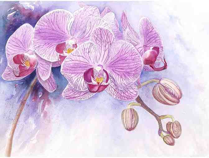 This beautiful image of an orchid in bloom is a giclee print of an original watercolor painting by Kauai artist Marcia Minnichhofer. Note the wonderful detail that can be discerned in this closeup of one of the Hawaiian flowers we love so much. The watercolor media used in the original gives a softness to the image that is so characteristic of this flower. This giclee print (2/150) measures 18" x 24".