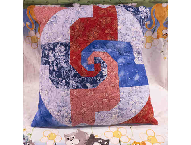 Striking handcrafted cat pillow quilted in radiant blues and pinks 20" x 20"