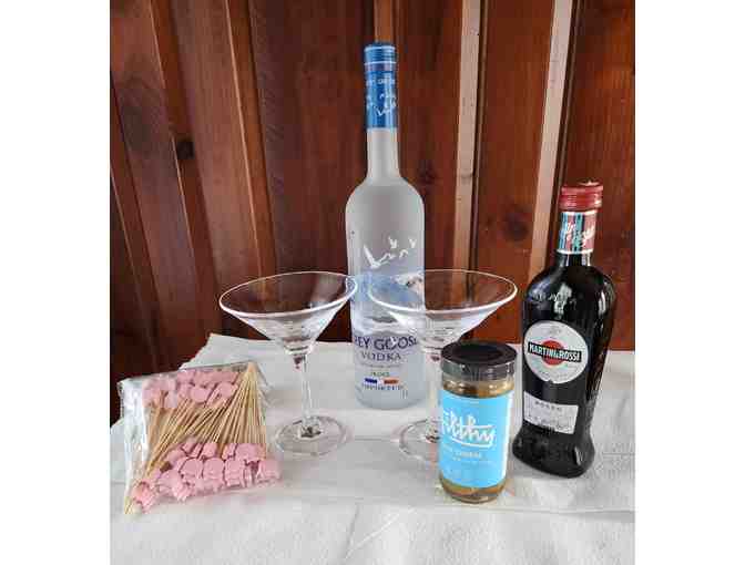 This package includes two Simon Pearce Woodbury Martini glasses, a one liter bottle of Grey Goose vodka, a 315 ml bottle of Martini & Rossi Vermuth, a jar of olives stuffed with blue cheese, and the cutest cocktail picks with kitty faces.