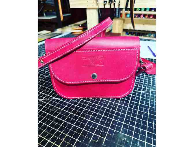 Small leather crossbody—about 8-9 inches wide and 7-8 tall. Made of American bridle leather in "Cactus Flower" pink.