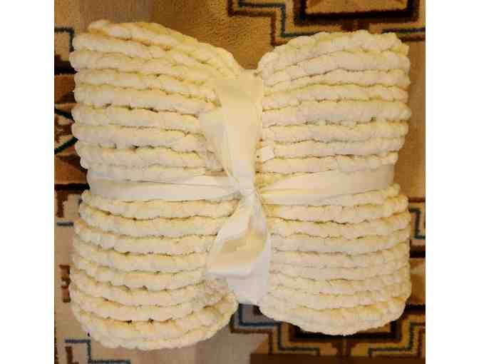 This incredibly soft off-white blanket is hand knit of chunky chenille yarn and measures 50" x 60". Picture a glass of wine, a good book, and a blazing fire!