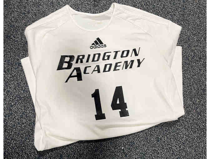 Game-worn white Bridgton #14 Adidas soccer jersey.
