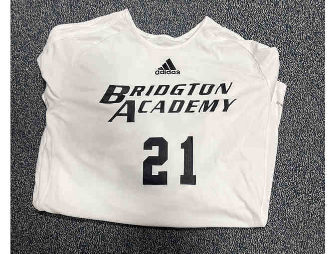 Game-worn white Bridgton #21 Adidas soccer jersey.