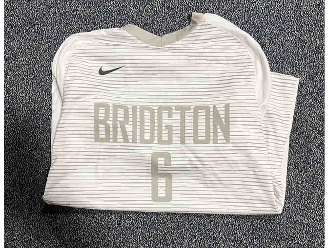 Game-worn white with gray Bridgton #6 Nike soccer jersey.