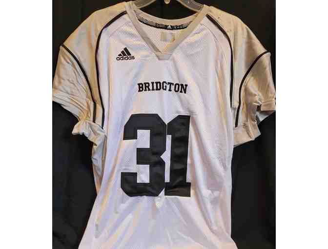 Game-worn white #31 Bridgton football jersey.