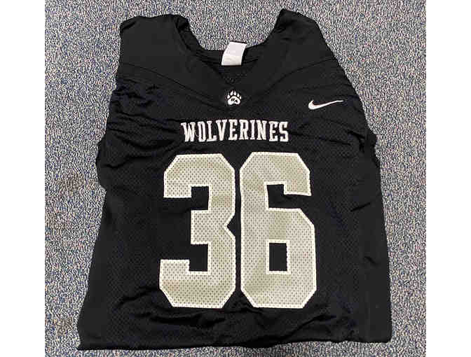 Game-worn black #36 Bridgton football jersey.