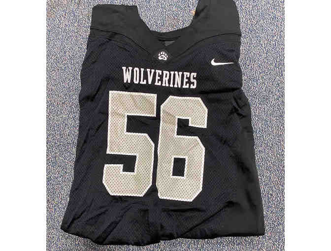 Game-worn black #56 Bridgton football jersey.