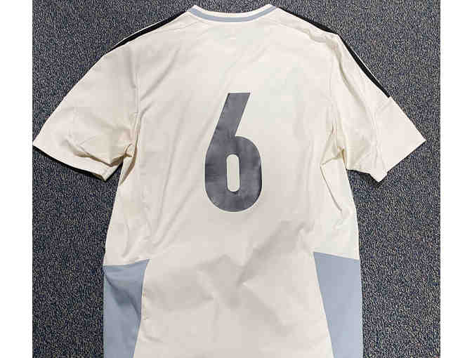 Game-worn white with gray stripes Bridgton #6 soccer jersey.