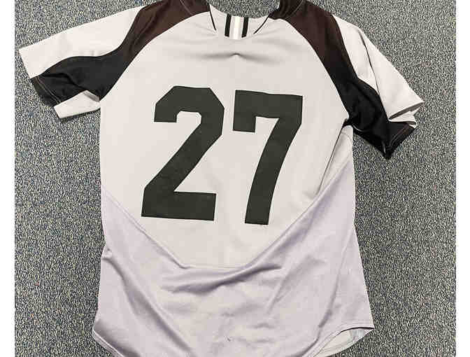 Game-worn gray with black Bridgton #27 baseball jersey.
