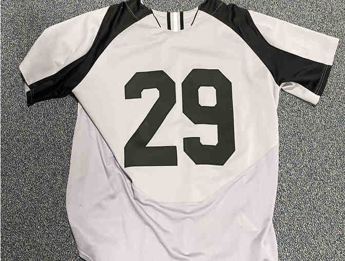 Game-worn gray with black Bridgton #29 baseball jersey.