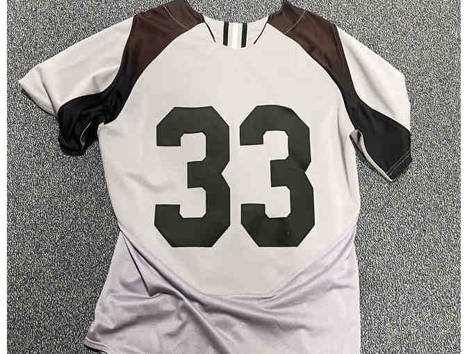 Game-worn gray with black Bridgton #33 baseball jersey.