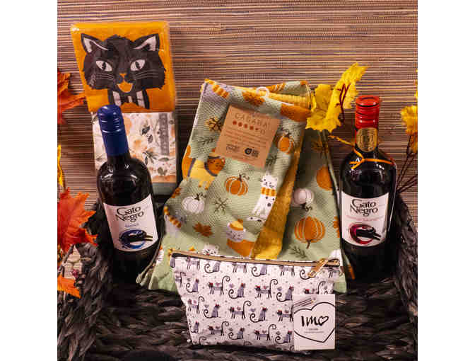 2 bottles of Gato Negro wine, 1 Merlot and 1 Cabernet Sauvignon, Candle, Dish towels, Socks, Napkins, Fall candy and Ceramic pumpkin.