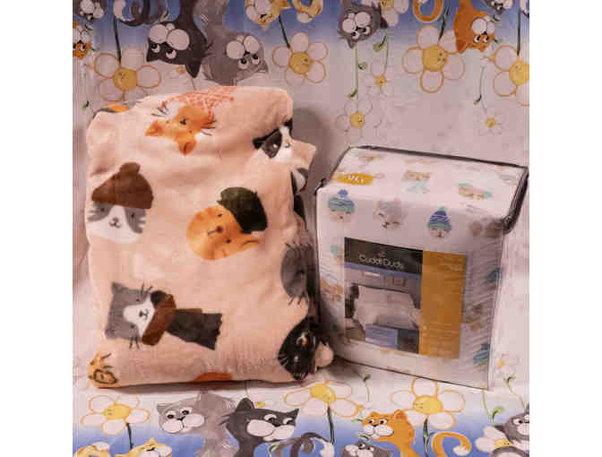 CuddlDuds heavyweight flannel sheet set (full) and Big One plush blanket 5' x 6' with delightful pussycat designs.