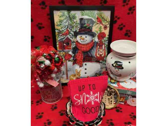 Enjoy this really flaky group celebrating the frostiest season. Framed diamond art snowman painting, snowman ornament, snowman scent warmer, 2 small bowls, decorative box, bouquet of pens and more.