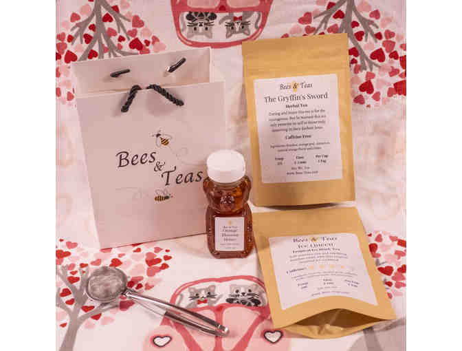 Connect with the bees with this set of teas and honey from Bees and Teas (bees-teas.com) 1 package of Gryffins Sword herbal tea, 1 package of Ice Queen Tropical Ice black tea, 8 oz. jar of Orange Blossom raw honey and a tea infuser.