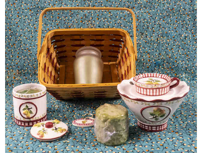 Let this wonderful scent warm your home. Spiced pear jar candle 18 oz. with ceramic shade topper, 3 candle with stand and 3 candle in crock with lid, all in a handsome square country basket.