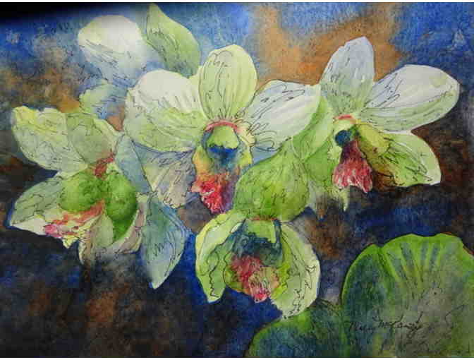 This item is an original watercolor painting by local artist Molly McKenzie. Here, she has captured the essence of our beloved Kaua'i orchids, depicting their exuberance with her soft watercolor paints. The luscious orchids are nicely set off by the colorful background and present a view of the flowers that many have not had the opportunity to see. This piece would be a wonderful addition to anyone's art collection.