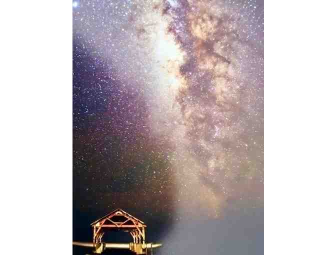 This item is a color photograph by Kaua'i artist Dr. Lloyd Fujimoto. A dimly illuminated image of the fishing pier at Waimea is superposed on a magnificent long-exposure photo of our Milky Way galaxy as seen from the clear skies of Kaua'i's westside. The prominent light bulge in the starry image is the center of our galaxy, located in the constellation Sagitarius. Light from these stars has travelled unimaginally far distances to bathe Kaua'i in its "divine radiance".