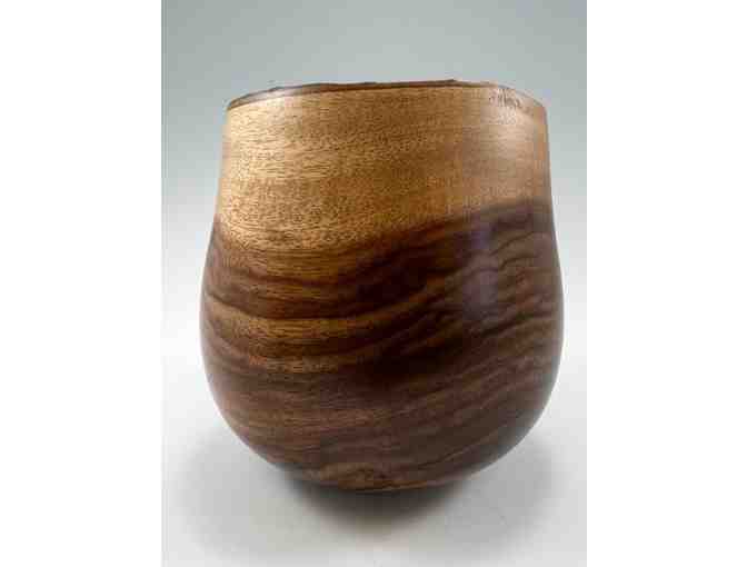 "Umeke Pala Pa'a" or "Divine Grace", is a 5" wide by 5 1/2" tall, heavy-bottomed calabash-styled bowl is made from the rare Kou tree. It's heavy bottomed to prevent tipping. Turned by woodworker Ray Nitta who left a natural edge, the vessel style accentuates the rich browns and gentle wood grain designs characteristic of Kou wood. This piece could be used decoratively or as a functional piece.
