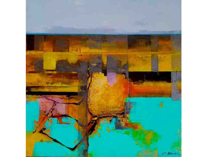 This is a fine art print on metal by local artist Carol Meckling. The colorful abstract perhaps evokes a memory of ancient Hawaiian petroglyphs that the viewer may have encountered in a few hidden locations around the islands. The blue/grey sky surmounts the colorful lava rocks and petroglyphs that are continually bathed by the turquoise surf. This striking work would be a welcome addition to anyone's art collection.
