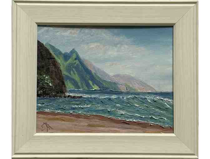 This item is an original acrylic painting on canvas by local artist Sandra Ambrose. Depicted is the iconic view of the Na Pali coast from the north side of Kaua'i. The verdant but jagged cliffs run down to the ocean under a fair sky. A rather large and turbulent swell in the sea is indicated by the brushwork.