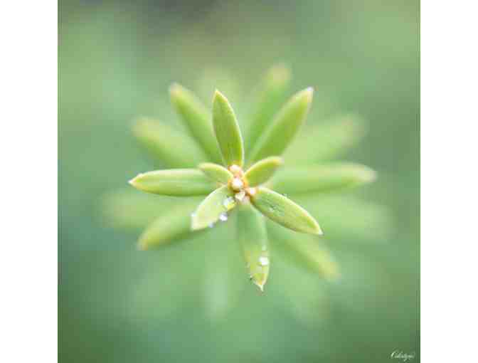 This item is an original photograph printed on metal plate by the Kauai artist Rhaya Celestyne. The symmetry of the growing end of the plant (lavender?) branch is brought out with great detail in the near field and much more softly in the background. One can almost smell the subtle fragrance of the green foliage.