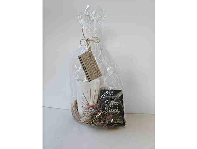 Includes a mug saying 'Everything comes to you at the right time, be patient" and Coffee Break scented wax melts.