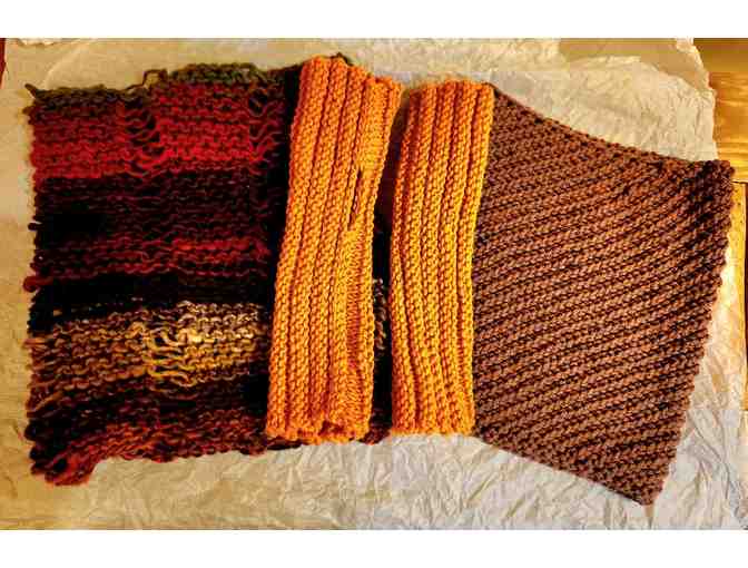 Two Hand knit cowls and mittzies