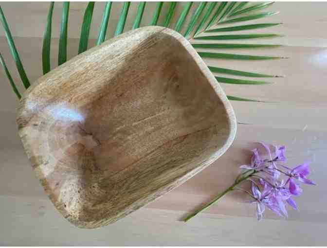 This item is a rectangular wood bowl created from Kaua'i mango wood by local craftsman Mark Hubbard. Overall, the bowl is light in color with a beautiful grain pattern. This piece could be used decoratively or as a functional piece and it measures 8 3/4" x 10 1/2" x 4" overall. This beautiful bowl could grace anyone's serving table or display shelf. This piece is part of Mark Hubbard's treasured private collection and he is sharing it with the auction in the hope that it will support the Center into the future for all people.