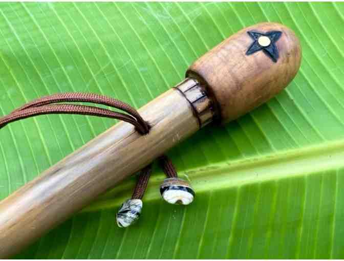 This unique, sturdy, one-of-a-kind, 42-inch walking stick was skillfully crafted by Dave Reando, an 88 Shrines volunteer, from the golden bamboo growing next to the Hall of Compassion at the Lawai International Center. The hand caps are crafted from lowland Koa or Koaia with a star design. Accenting the walking stick are two Glass Lampwork Beads created in Dave Reando’s Kalaheo studio.  Crafting Lampwork Beads has been a passion for Dave for almost 20 years, especially during the cold winter months Dave used to spend in southern Illinois in the past.