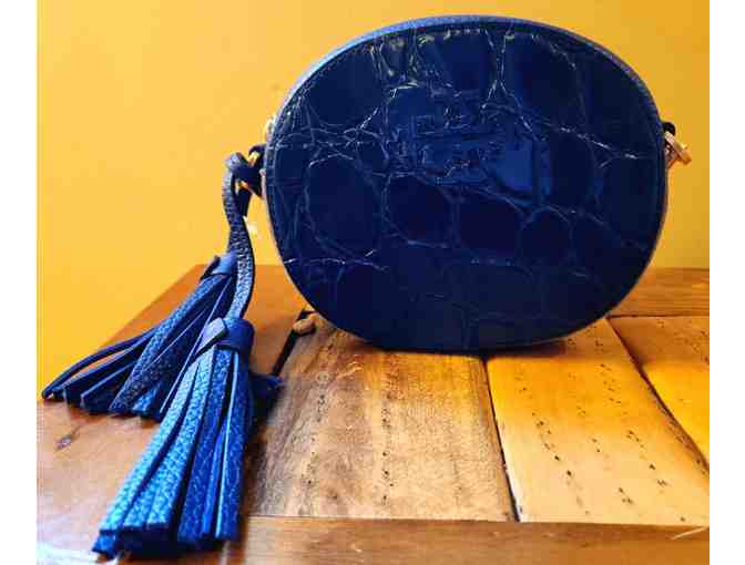 Tory Burch small cross-body handbag. The bag is navy blue leather with suede trim and measures 5.5" x 7". The shoulder strap is adjustable . The interior has only credit card slots (no zippered compartments). The Tory Burch logo is on the front of the bag.