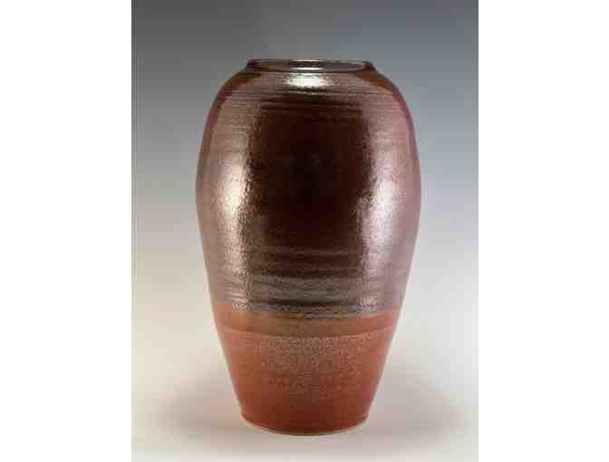 This medium ceramic vase measures 11" x 6". The primary glaze has deep reds and browns with black texturing. The undercoat carries a persimmon hue. It was high-fired at Kaua'i Community College.