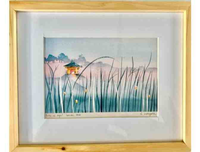 Watercolor print by Hawaiian artist Susan Satogata. This delightful print measures 8" x 10". Framed in the cedar wood from the Hall of Compassion in Lawai. Finished measurements are 11" by 13 1/4".