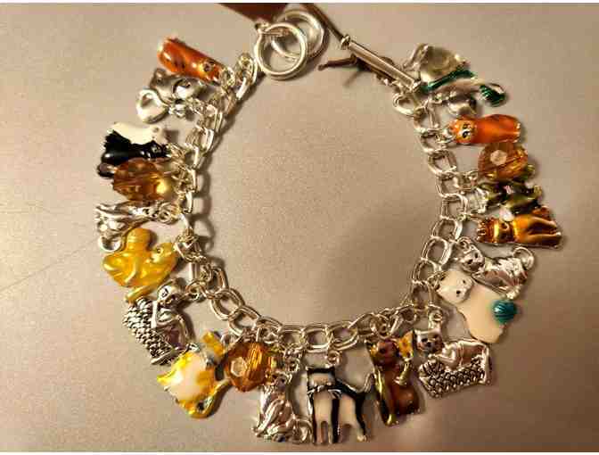 8" light-weight bracelet fitted with 16 cat charms in different colors, shapes and positions! Accented with golden glass baubles. Has toggle latch.