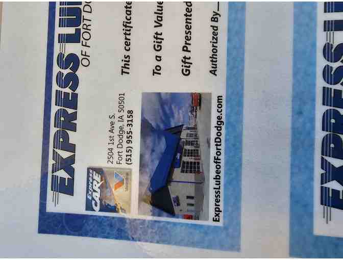 Each of these oil change certifiates at Express Lube of Fort Dodge are valued at $79.99! Their fast, friendly and knolwedgable crew will get you in and out for your oil change in no time.