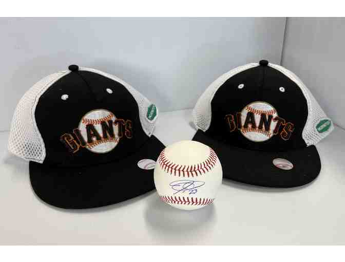 Autographed SF Giants Joc Pederson Baseball and Two Giants Hats