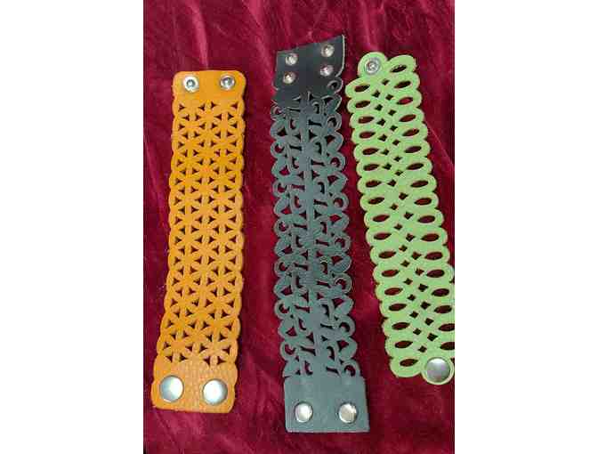 Three lazer cut leather snap bracelets Olive, Black, Burnt Orange , approx. 6"