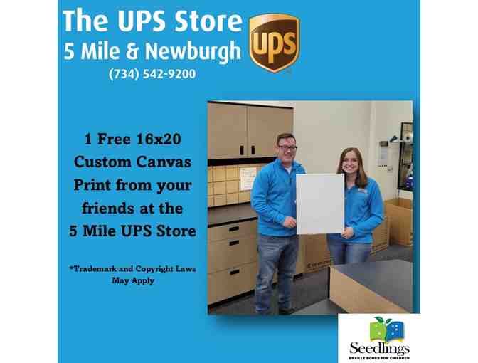 Your friends at the 5 Mile UPS Store in Livonia are happy to present Seedlings' Auction bidders with a free 16"x20" canvas print. Whether it's a wedding photo, a treasured family portrait, or your own unique art, this photo quality print will make your home or office wall stand out!
