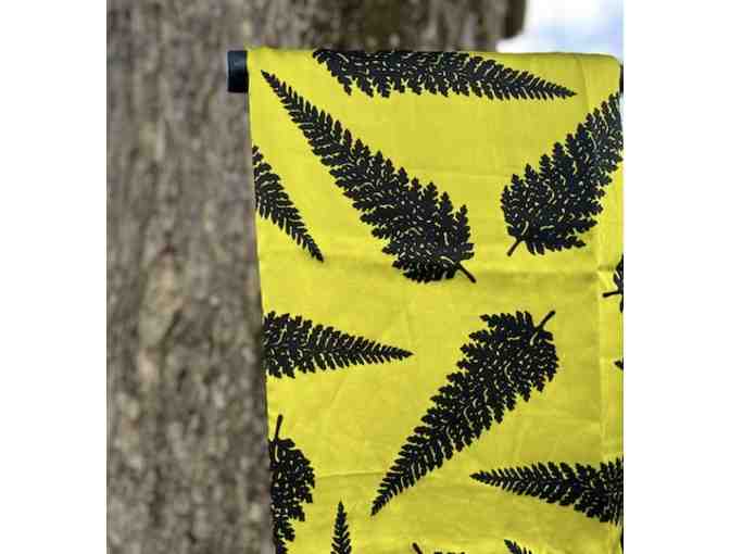 This exclusive silk scarf is handcrafted in palapali print in applegreen black color. There is something soothing about a stand of palapalai ferns. Perhaps it is the vibrant green, or the lacy softness they add to the landscape. Interesting that the early Hawaiians used the fern as a treatment for hehena (translation: insanity) according to the Hawaiian Enthnobotany online database. Palapalai is also valued as a plant sacred to the hula goddess Laka, and softly encircles the head, wrists, and ankles of the dancers of hula kahiko.