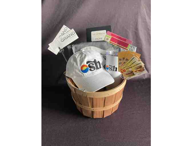 Discover Oshkosh hat & thermos, Membership to Paine Art Center and Gardens, Cake or Cupcakes from Cake Guru, 2 Tickets to The Grand Oshkosh Mar 2 – 4 "The Fourth Wall-Hybrid Arts Ensemble", McDonalds free beverages & breakfast sandwiches