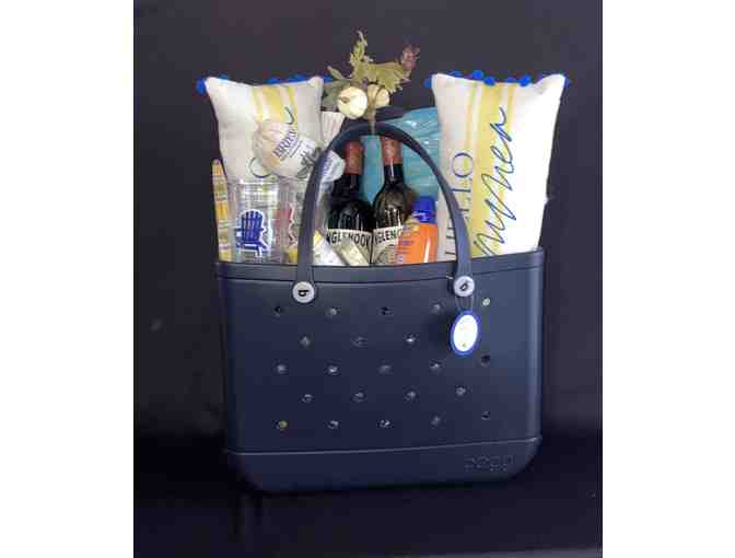 2 Pack beach towels, Banana Boat Sunscreen, paper plates, napkins, coasters, 4 tumblers, Briess Malted Milk Balls, Bottle of Blancaneaux, Bottle of Sauvignon Blanc all in a BOGG bag!