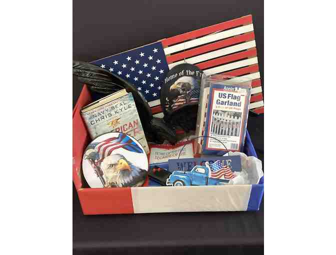 Wooden American Flag, 2 American Eagle plates, American Sniper book, US Flag Garland, Cooler, Metal Welcome Sign, Keyring Flashlight